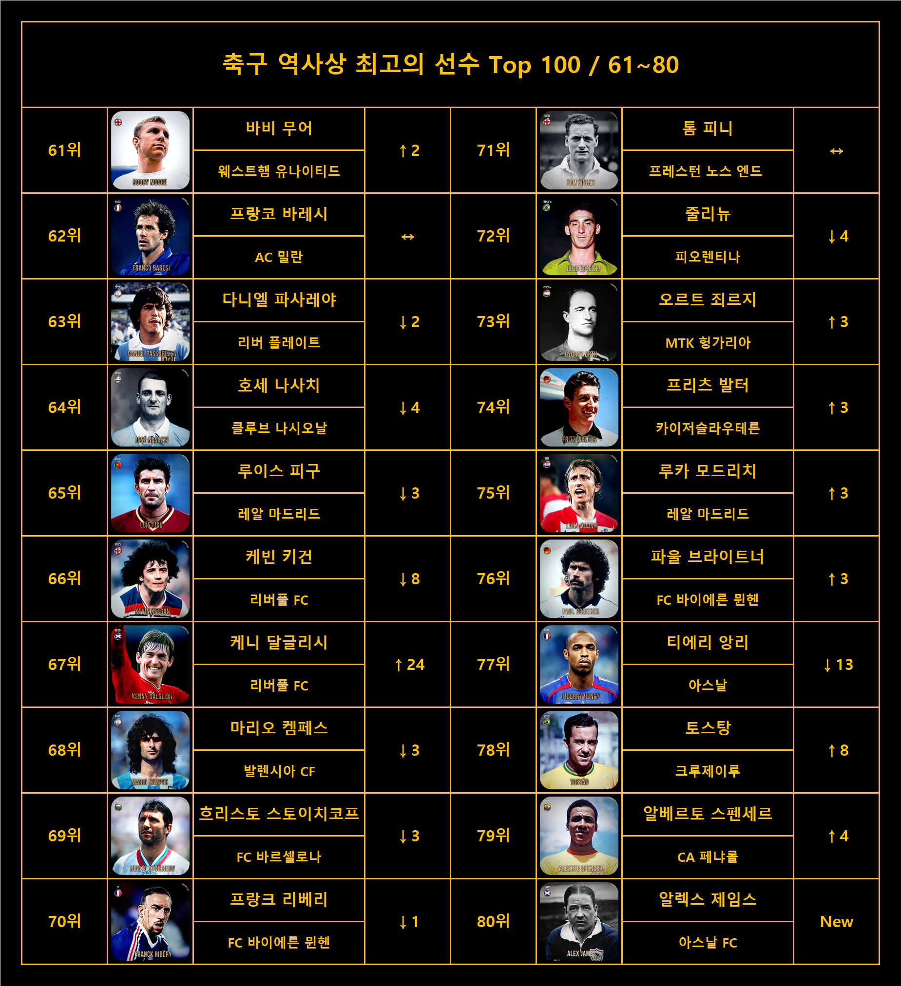 아래는 변동된 순위고 이번엔 별도의 설명은 없습니다. 다만 이전보다 팀의 플레이메이킹을 책임지는 포지션인 처진 공격수와 공격형 미드필더에 큰 버프를 줬습니다.